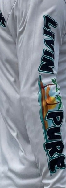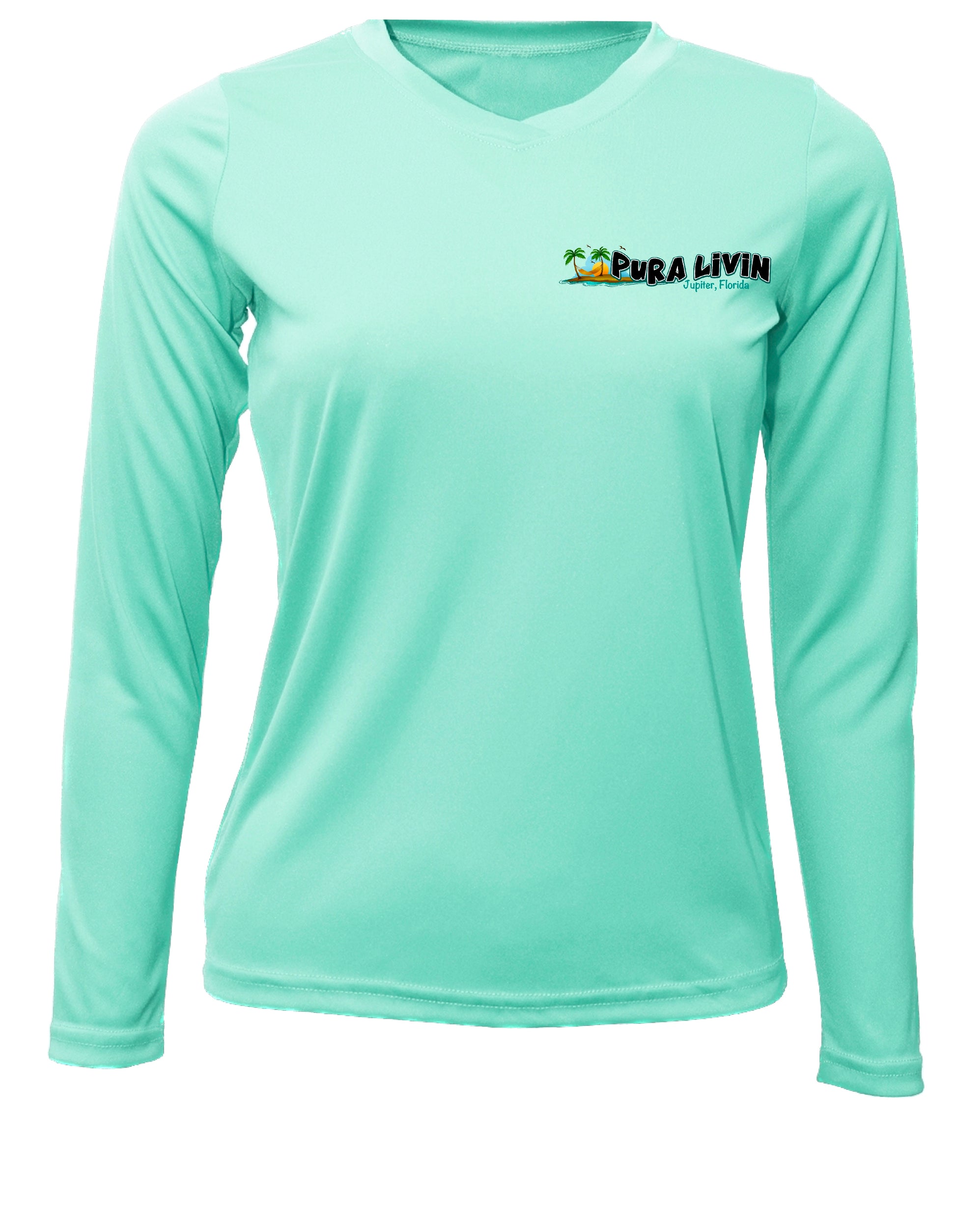 Designed for women with a front V-Neck, this shirt features our iconic logo on the back, symbolizing a spirit of optimism and embracing each new day. Livin Pure adorns the right sleeve, showcasing your dedication to an active and vibrant lifestyle.