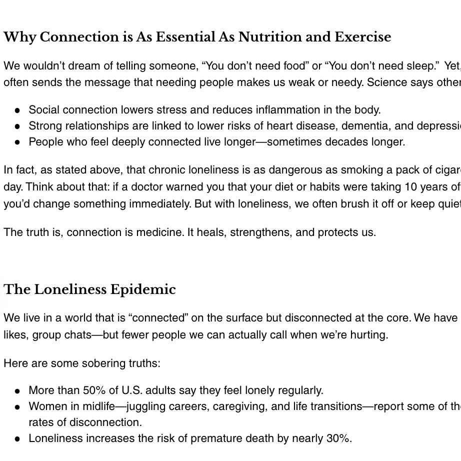 I created this course because I’ve seen how powerful real connection is — and how lonely life can feel without it. In midlife, our circles change. Kids grow up, priorities shift, and we start craving deeper, more genuine friendships.