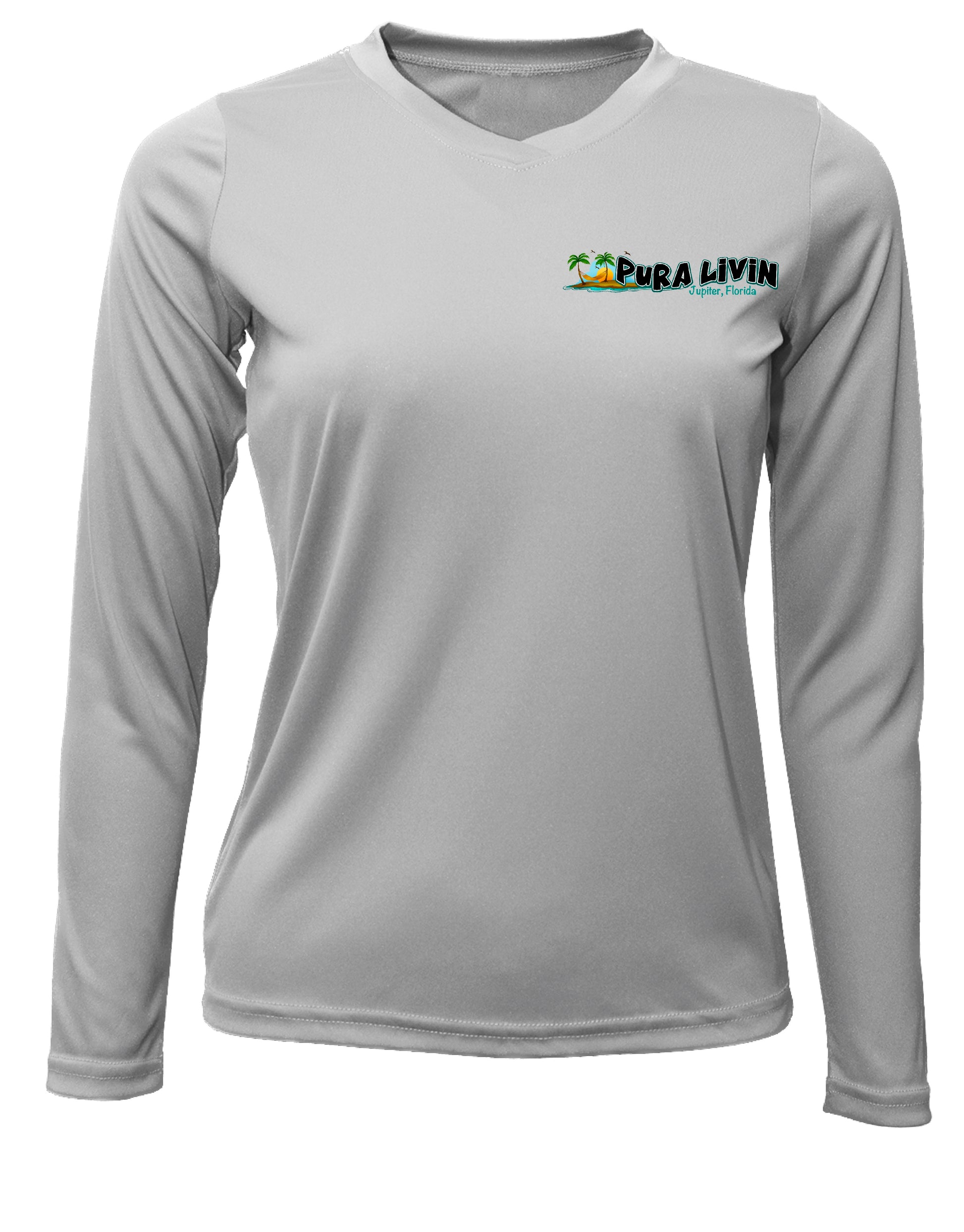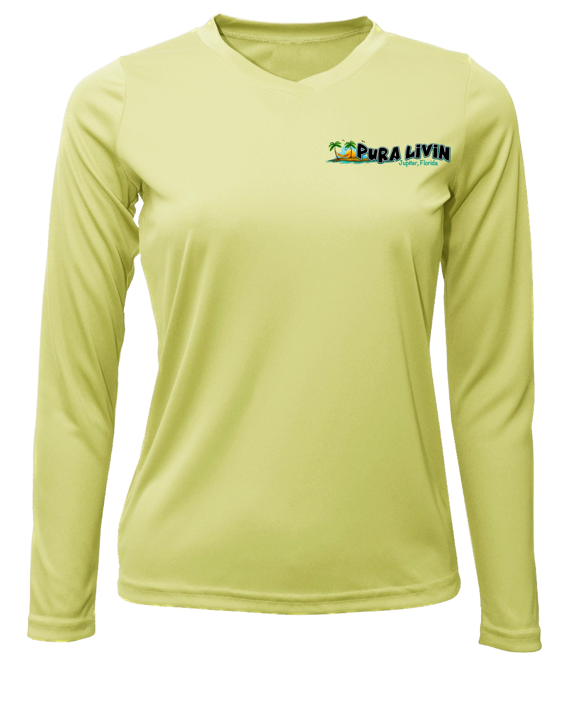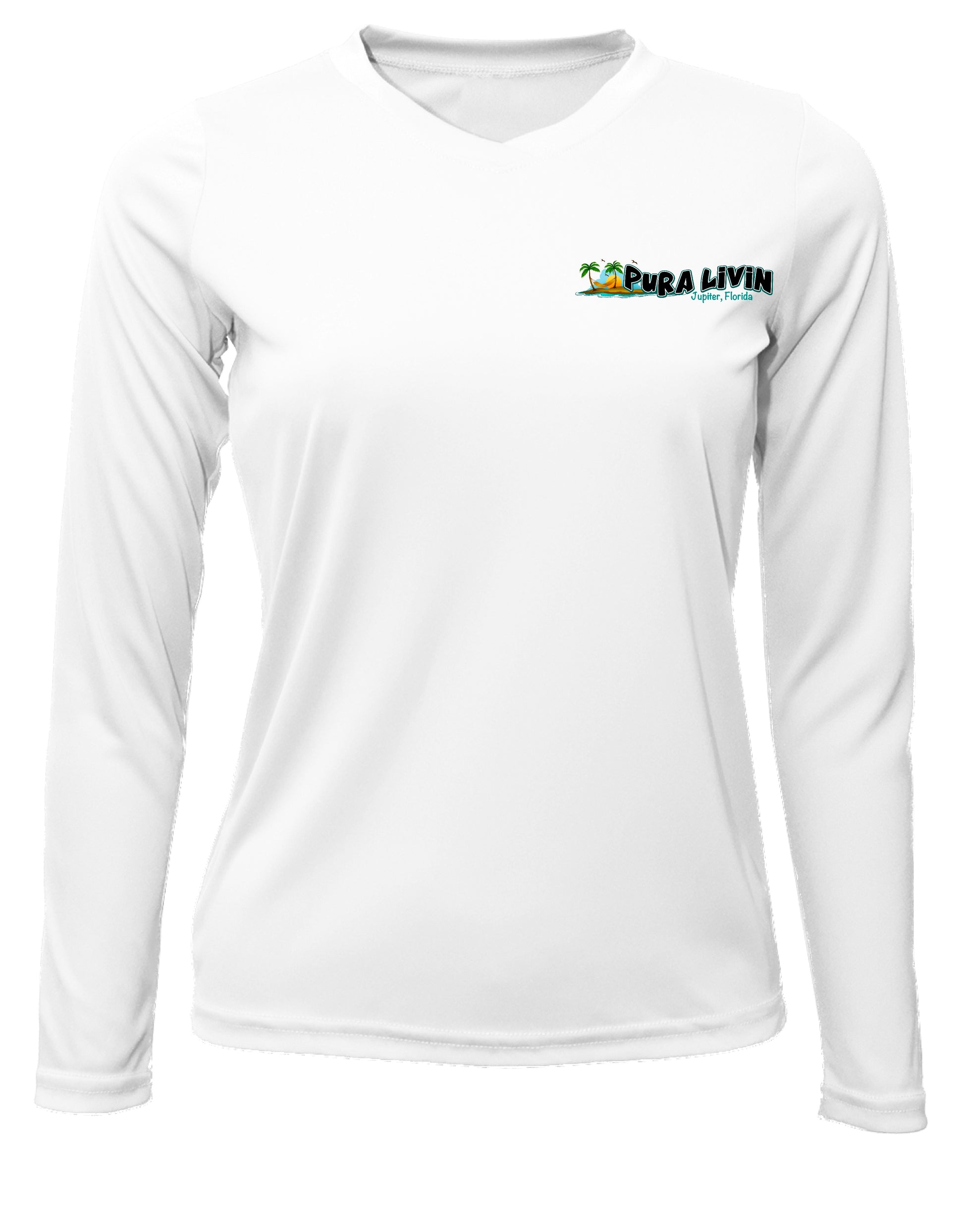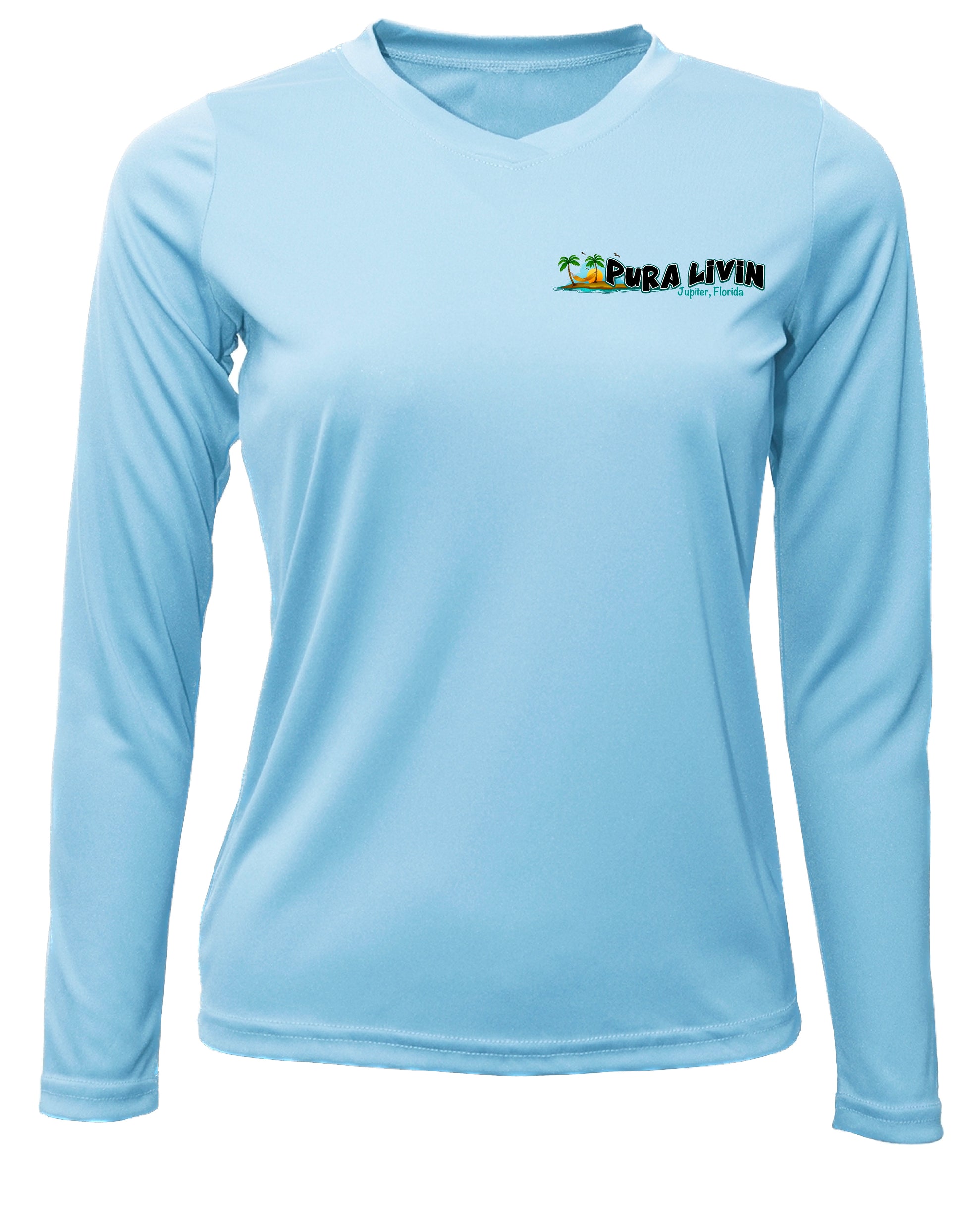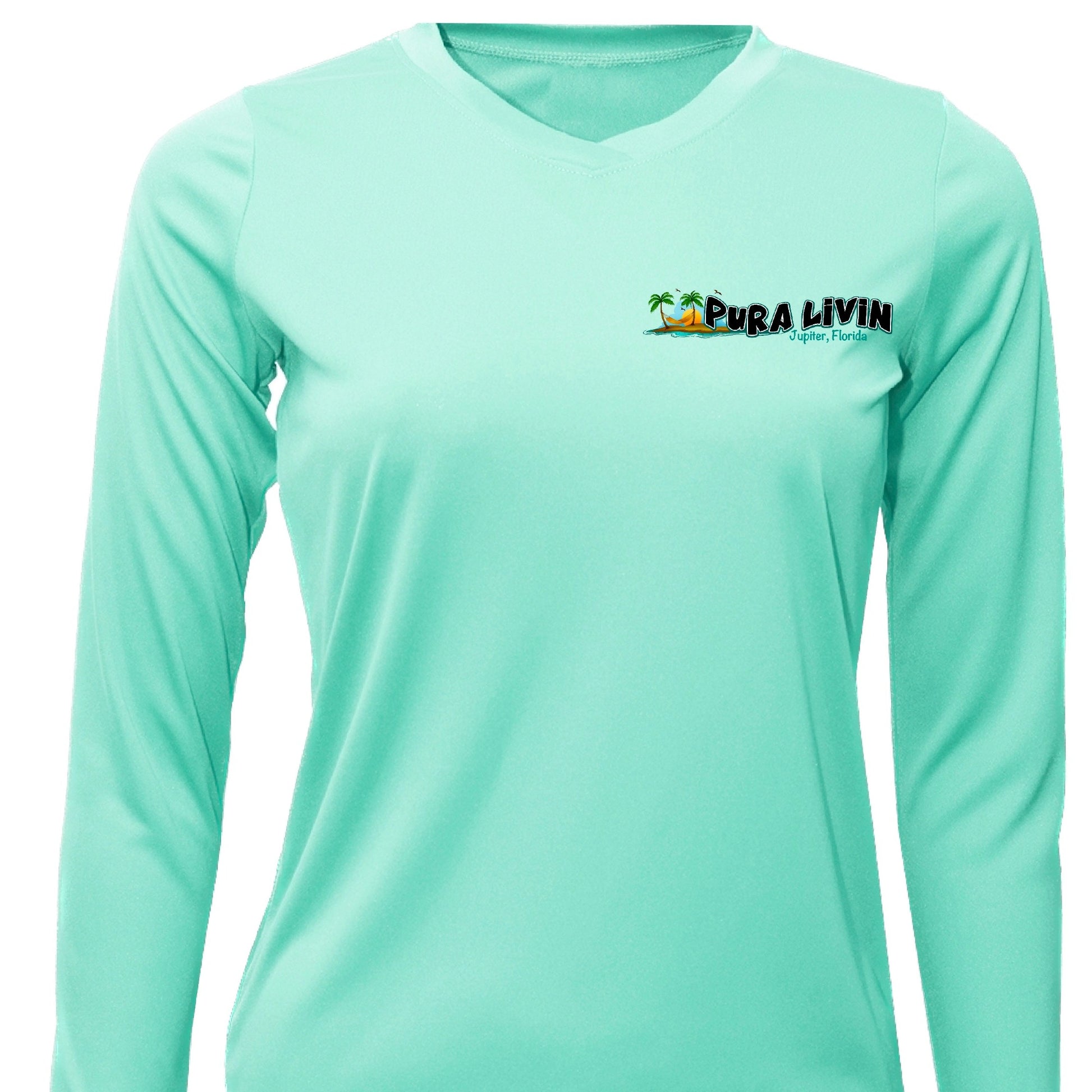 Introducing our Pura Livin Sea Turtle Women's V-Neck Performance Shirt, a perfect blend of style and functionality for women. Crafted with high-performance fabric, this shirt is designed to keep you comfortable during your active adventures under the sun, offering moisture-wicking and quick-drying properties.