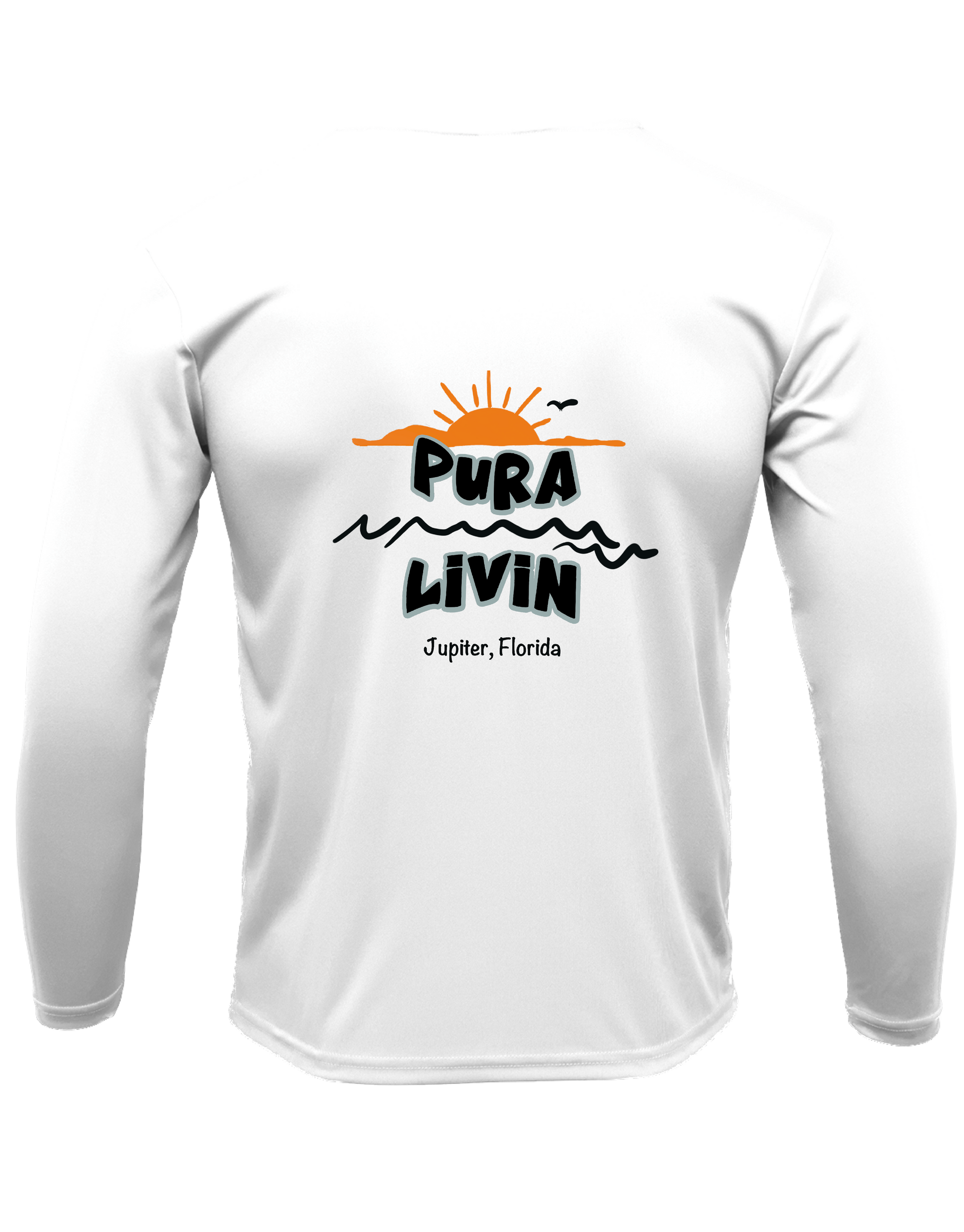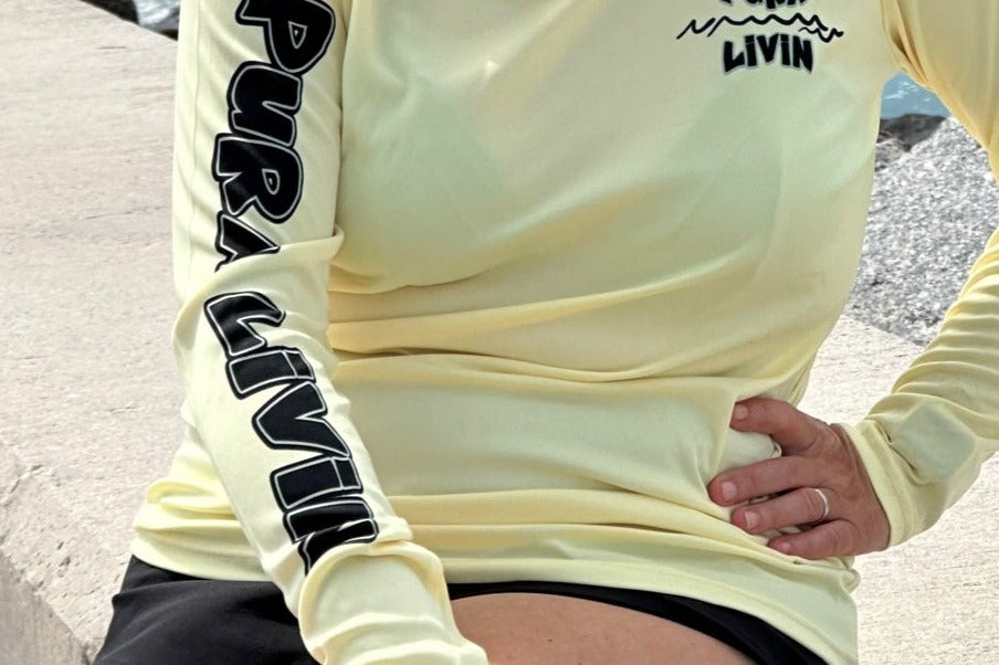 Designed for both men and women, this shirt features our iconic "Here Comes the Sun" logo on the back and the Pura Livin logo down the right sleeve, symbolizing a spirit of optimism and embracing each new day.