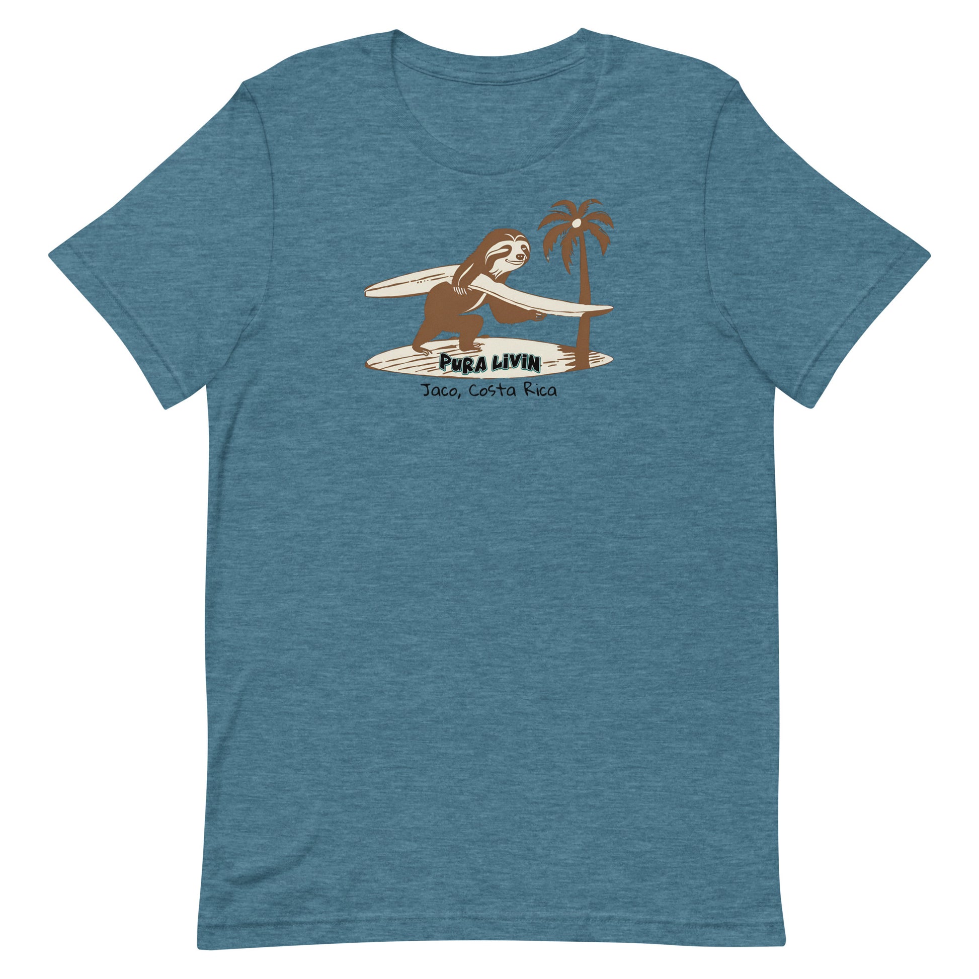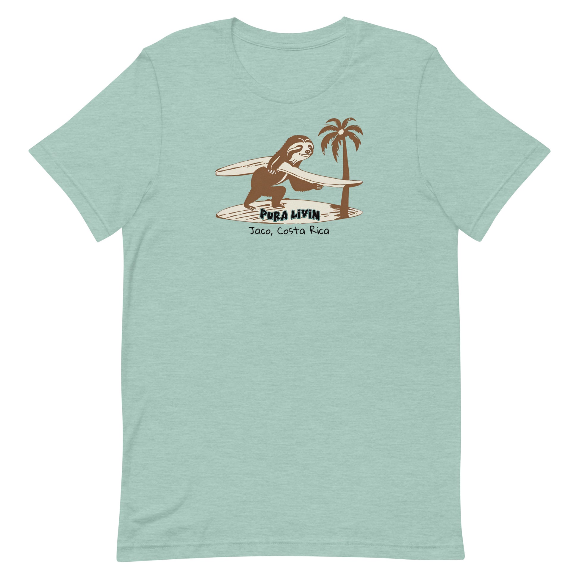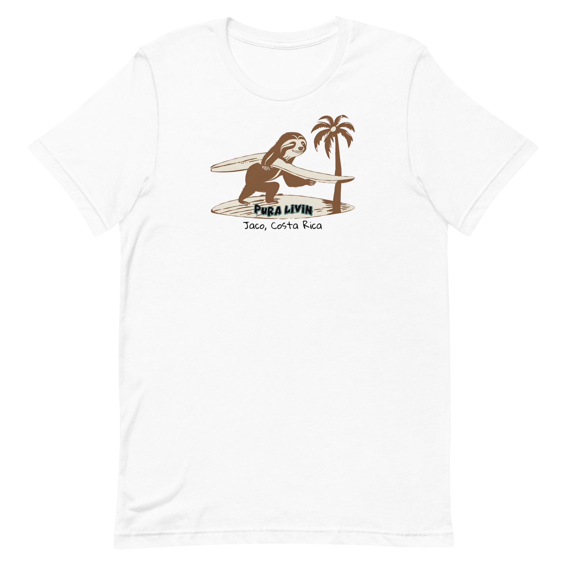 Channel laid-back vibes with our soft, unisex t-shirt featuring a custom graphic of a surfing sloth in well known Jaco, Costa Rica. Crafted from a smooth blend of solid and heather cotton fabrics, this tee is perfect for everyday wear, offering a relaxed fit and a touch of Pura Livin adventure.