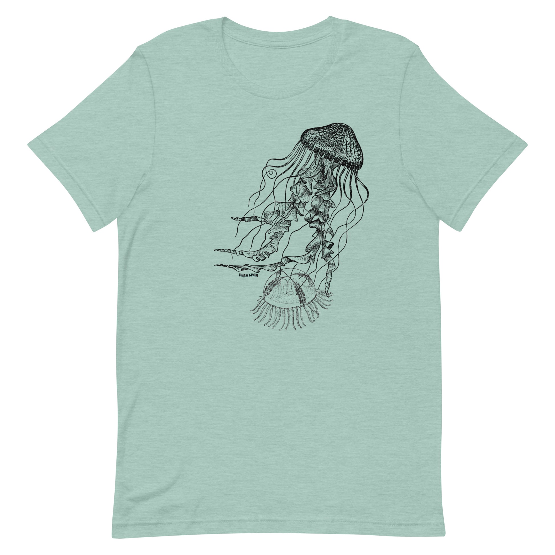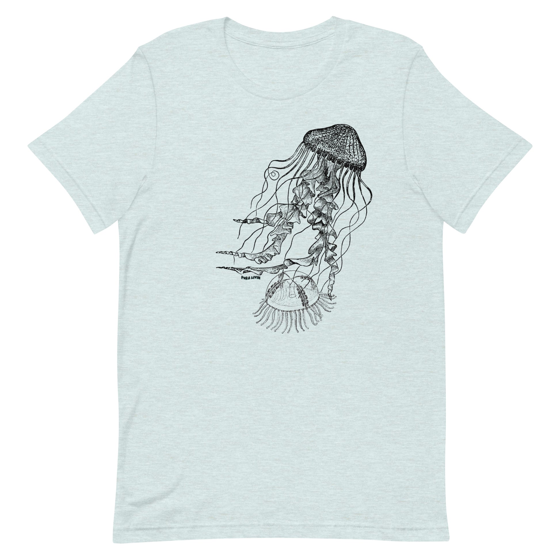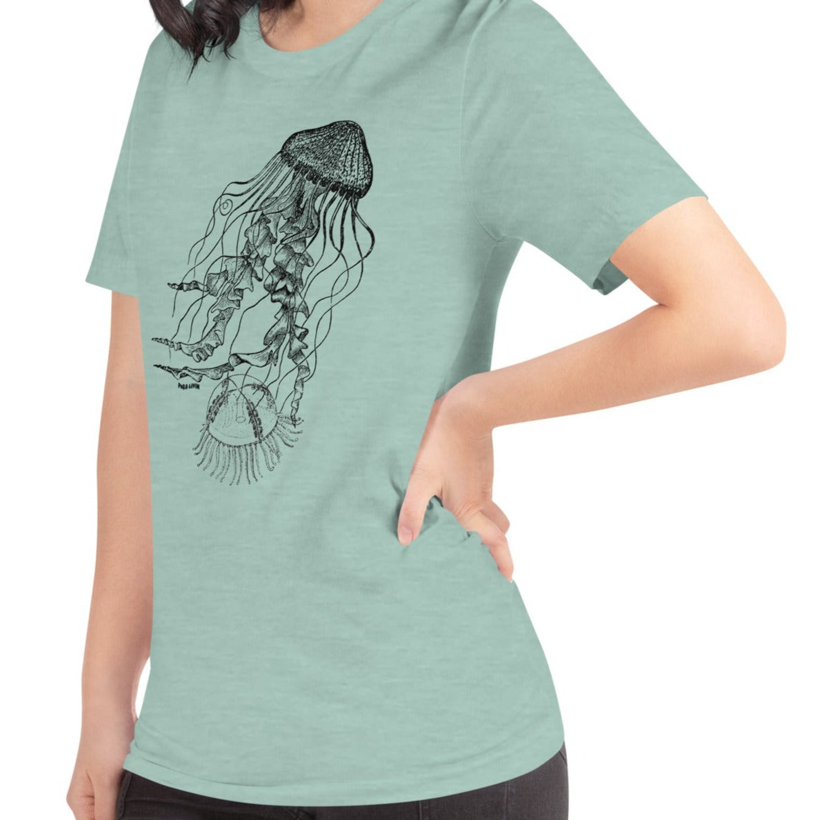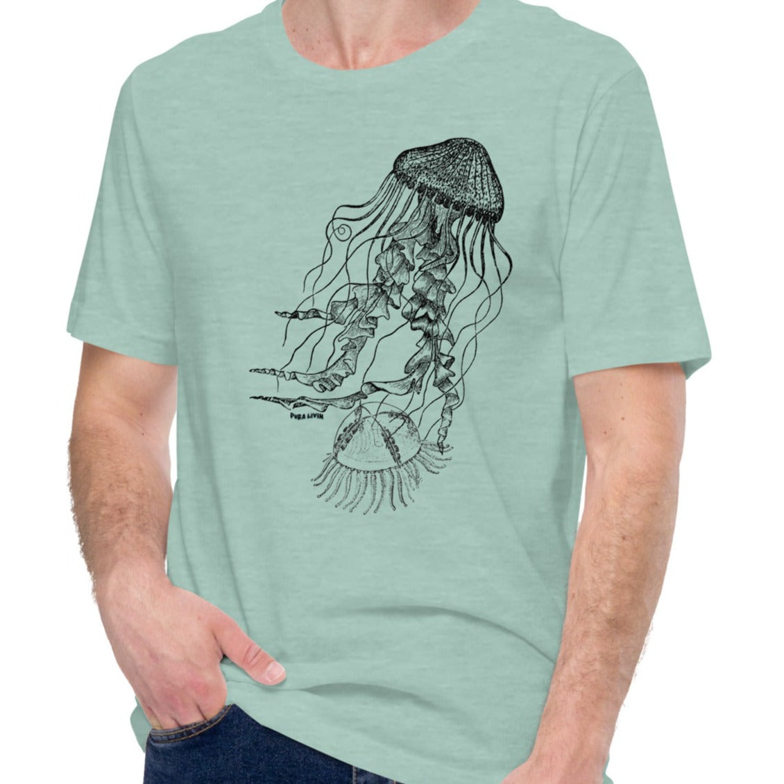 Featuring a vintage drawing of water jellies, it adds an artistic and nature-inspired element to your wardrobe. This tee serves as a symbol of your love for the ocean, adventure, and embracing a sustainable lifestyle.
