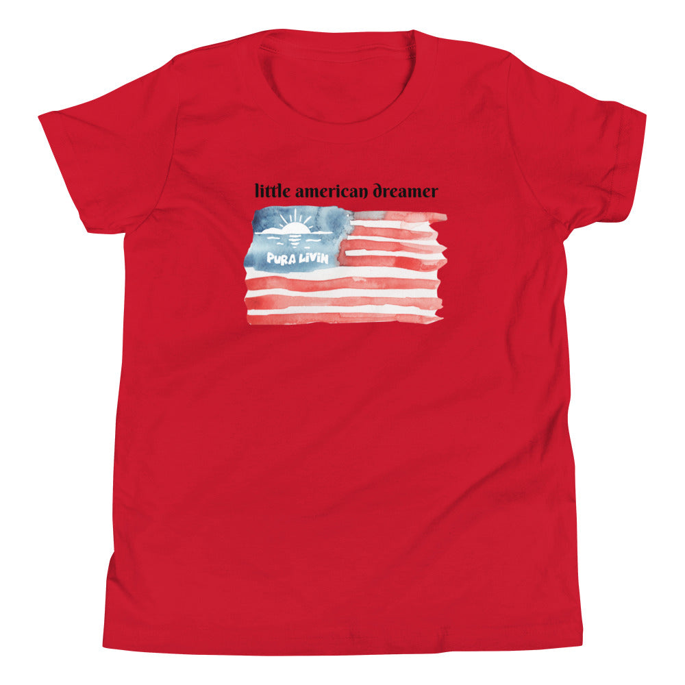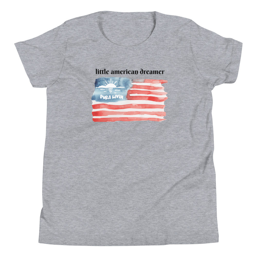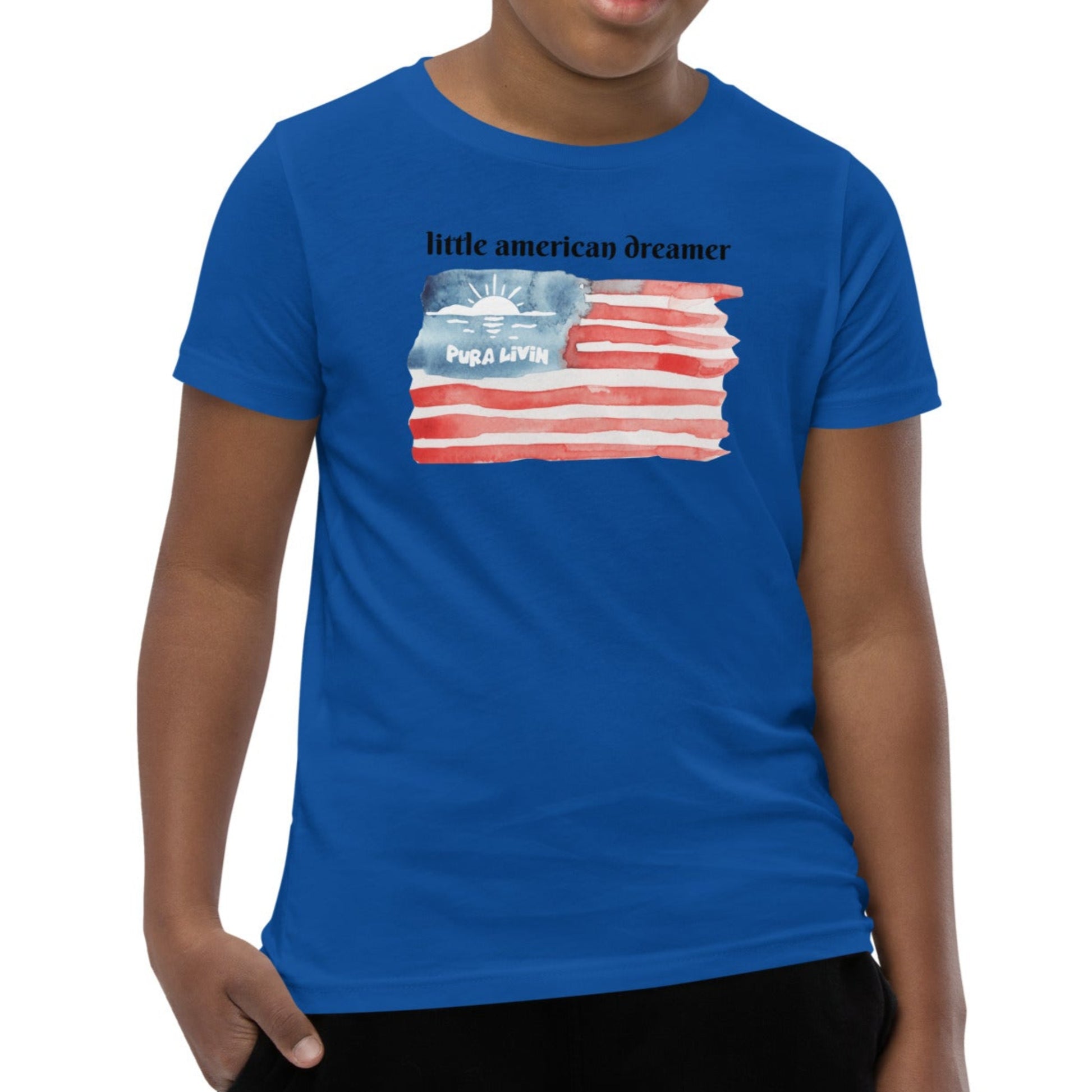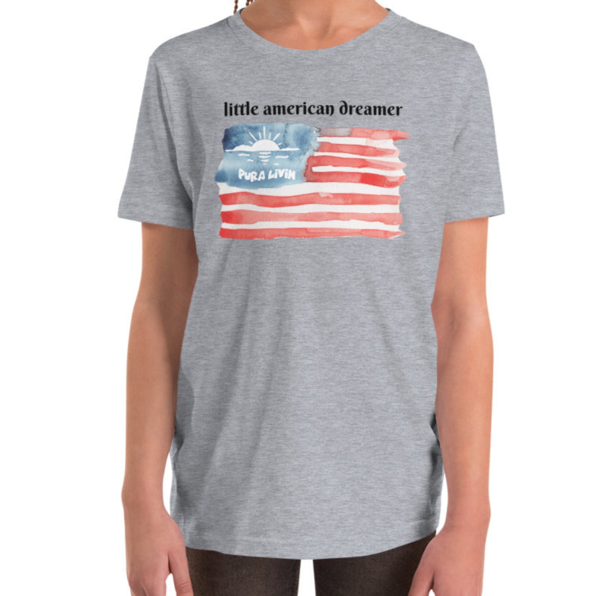 Celebrate the spirit of America with our Littile American Dreamer Youth Eco-friendly Cotton Tee. This tee proudly displays a classic American flag design, perfect for showcasing your patriotic vibes.